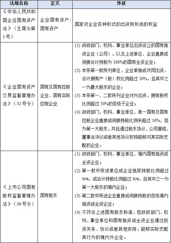 我國(guó)的國(guó)資監(jiān)管立法尚未對(duì)“國(guó)有股東”提出普適定義,通常是應(yīng)具體監(jiān)管事項(xiàng)的要求在相應(yīng)規(guī)定中進(jìn)行專項(xiàng)規(guī)定。姑且不提《關(guān)于對(duì)國(guó)有公司企業(yè)認(rèn)定意見(jiàn)的函》(國(guó)統(tǒng)函[2003]44號(hào))、《國(guó)務(wù)院國(guó)有資產(chǎn)監(jiān)督管理委員會(huì)關(guān)于施行<上市公司國(guó)有股東標(biāo)識(shí)管理暫行規(guī)定>有關(guān)問(wèn)題的函》(國(guó)資廳產(chǎn)權(quán)[2008]80號(hào))等老規(guī)定中關(guān)于國(guó)有企業(yè)、國(guó)有股東等的定義,即使是在《企業(yè)國(guó)有資產(chǎn)法》、32號(hào)令、36號(hào)令項(xiàng)下也有不同的定義,如下所示: