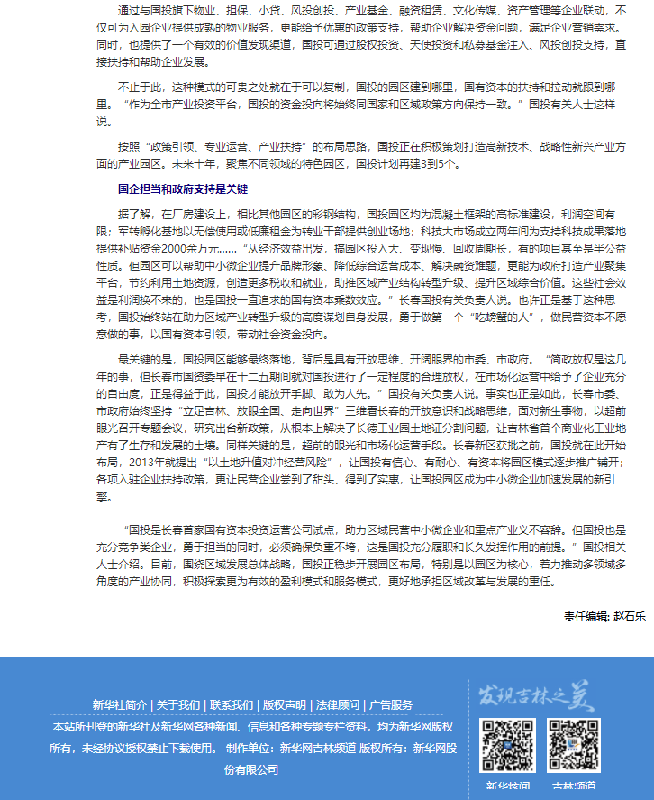 最關(guān)鍵的是,國(guó)投園區(qū)能夠最終落地,背后一個(gè)具有開放思維、開闊眼界的市委、市政府至關(guān)重要。“簡(jiǎn)政放權(quán)是這幾年的事,但長(zhǎng)春市國(guó)資委早在十二五期間就對(duì)國(guó)投進(jìn)行了一定程度的合理放權(quán),在市場(chǎng)化運(yùn)營(yíng)中給予了企業(yè)充分的自由度,正是得益于此,國(guó)投才能放開手腳、敢為人先!眹(guó)投有關(guān)負(fù)責(zé)人說(shuō)。事實(shí)也正是如此,長(zhǎng)春市委、市政府始終堅(jiān)持“立足吉林、放眼全國(guó)、走向世界”三維看長(zhǎng)春的開放意識(shí)和戰(zhàn)略思維,面對(duì)新生事物,以超前眼光召開專題會(huì)議研究出臺(tái)新政策,從根本上解決了長(zhǎng)德工業(yè)園土地證分割問(wèn)題,讓吉林省首個(gè)商業(yè)化工業(yè)地產(chǎn)有了生存和發(fā)展的土壤。同樣關(guān)鍵的是,超前的眼光和市場(chǎng)化運(yùn)營(yíng)手段。長(zhǎng)春新區(qū)獲批之前,國(guó)投就在此開始布局,2013年就提出“以土地升值對(duì)沖經(jīng)營(yíng)風(fēng)險(xiǎn)”,讓國(guó)投有信心、有耐心、有資本將園區(qū)模式逐步推廣鋪開;各項(xiàng)入駐企業(yè)扶持政策,更讓民營(yíng)企業(yè)嘗到了甜頭、得到了實(shí)惠,讓國(guó)投園區(qū)成為了政府與民營(yíng)企業(yè)對(duì)接、中小微企業(yè)加速發(fā)展的新引擎。