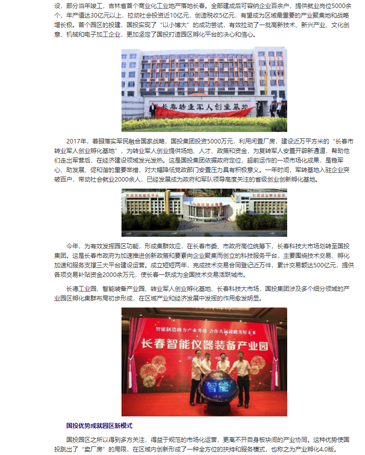 長(zhǎng)德工業(yè)園、智能裝備產(chǎn)業(yè)園、轉(zhuǎn)業(yè)軍人創(chuàng)業(yè)孵化基地、長(zhǎng)春科技大市場(chǎng),國(guó)投集團(tuán)涉及多個(gè)細(xì)分領(lǐng)域的產(chǎn)業(yè)園區(qū)孵化集群布局初步形成,在區(qū)域產(chǎn)業(yè)和經(jīng)濟(jì)發(fā)展中發(fā)揮的作用愈發(fā)明顯。
