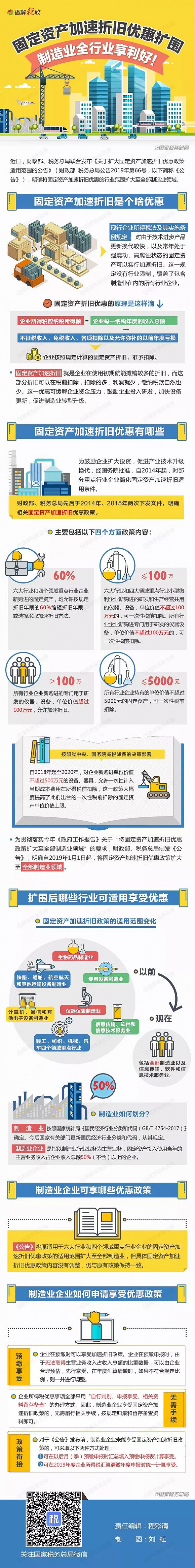 近日,財(cái)政部、稅務(wù)總局聯(lián)合發(fā)布《關(guān)于擴(kuò)大固定資產(chǎn)加速折舊優(yōu)惠政策適用范圍的公告》(財(cái)政部 稅務(wù)總局公告2019年第66號(hào)),明確將固定資產(chǎn)加速折舊優(yōu)惠的行業(yè)范圍擴(kuò)大至全部制造業(yè)領(lǐng)域。固定資產(chǎn)加速折舊是個(gè)啥優(yōu)惠?制造業(yè)企業(yè)如何享受這一優(yōu)惠政策?一張圖告訴你。