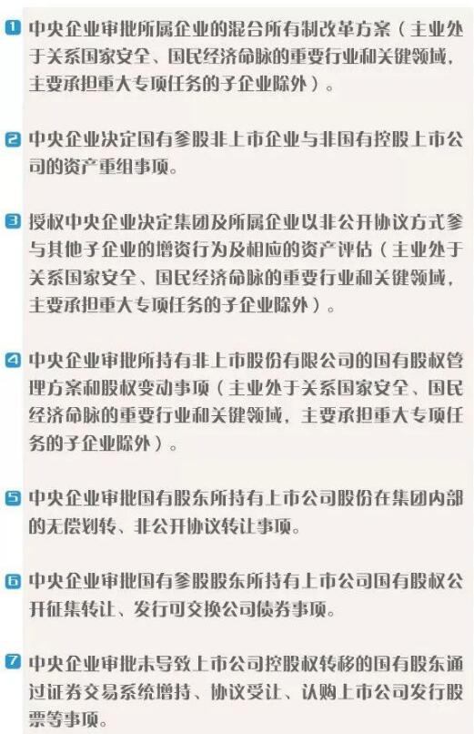 國務(wù)院國資委將加強(qiáng)事中事后監(jiān)管,采取健全監(jiān)管制度、統(tǒng)籌監(jiān)督力量、嚴(yán)格責(zé)任追究、搭建實(shí)時在線的國資監(jiān)管平臺等方式,確保該放的放權(quán)到位、該管的管住管好,實(shí)現(xiàn)授權(quán)與監(jiān)管相結(jié)合、放活與管好相統(tǒng)一。