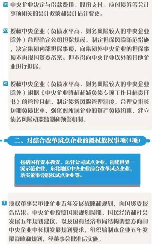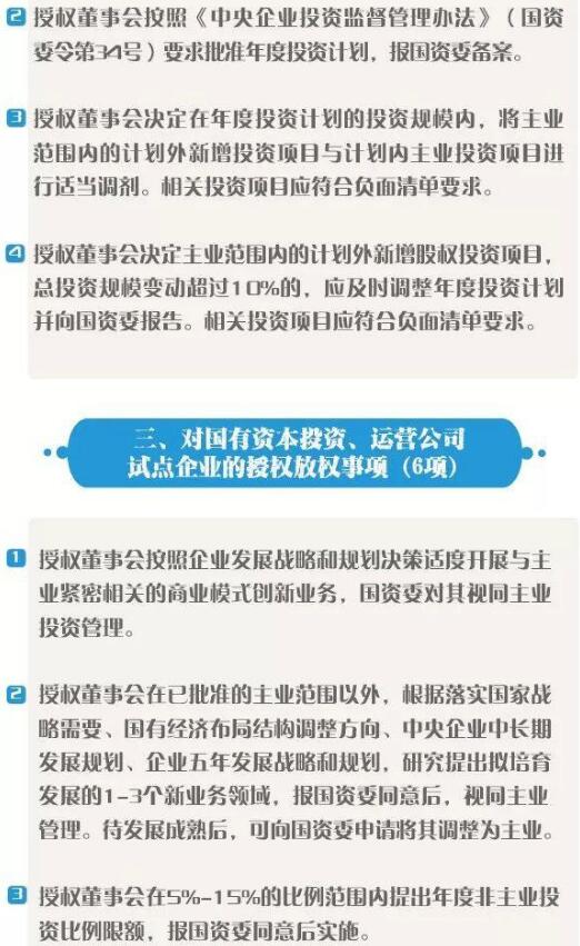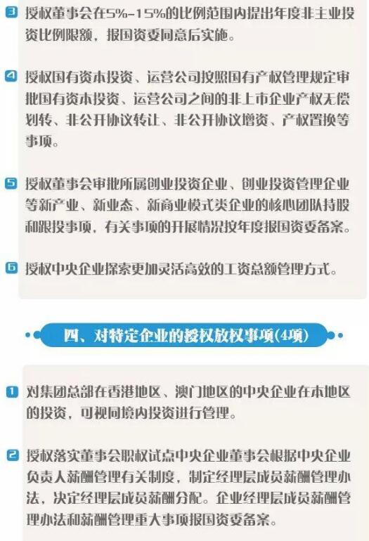 《清單》結(jié)合企業(yè)的功能定位、治理能力、管理水平等企業(yè)改革發(fā)展實(shí)際,分別針對各中央企業(yè)、綜合改革試點(diǎn)企業(yè)、國有資本投資、運(yùn)營公司試點(diǎn)企業(yè)以及特定企業(yè)相應(yīng)明確了授權(quán)放權(quán)事項(xiàng)。同時,集團(tuán)公司要對所屬企業(yè)同步開展授權(quán)放權(quán),做到層層“松綁”,全面激發(fā)各層級企業(yè)活力。