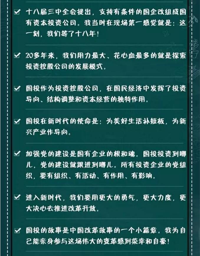 “中國經(jīng)濟這40年的變化,就是從計劃經(jīng)濟到商品經(jīng)濟、到市場經(jīng)濟的體制改革過程,就是從粗放到集約的結(jié)構(gòu)調(diào)整過程,也是從高速發(fā)展到高質(zhì)量發(fā)展的轉(zhuǎn)型過程。國投的故事應(yīng)該說是一個點,但是走過的這個軌跡恰是我們國家投資體制改革的一個全過程。”