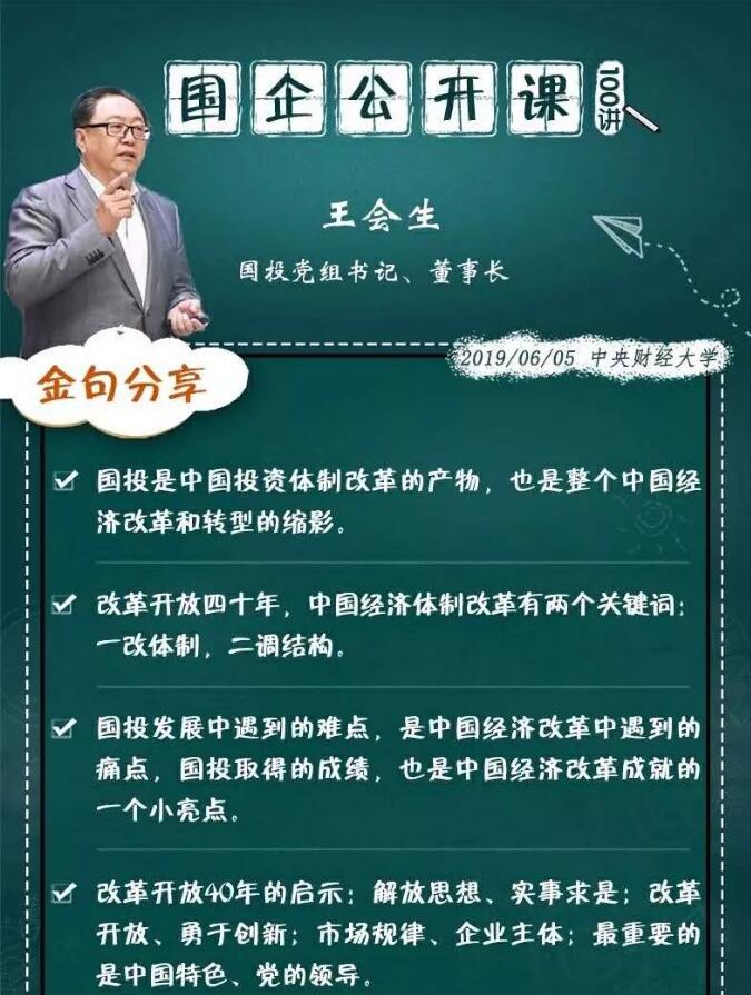 4月2日,國資委黨委和教育部聯(lián)合開展的“領(lǐng)導(dǎo)干部上講臺”——國企公開課100講、國企骨干擔(dān)任校外輔導(dǎo)員活動正式啟動。6月5日,國家開發(fā)投資集團有限公司黨組書記、董事長王會生來到中央財經(jīng)大學(xué),以“從國投看中國投資體制改革”結(jié)合國投成立、發(fā)展、壯大、轉(zhuǎn)型經(jīng)歷講述中國投資體制改革和國企改革故事。小新為您分享金句如下——
