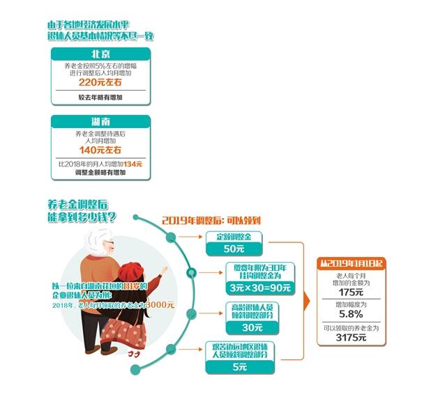 比如,北京市人力資源和社會保障局發(fā)布的調(diào)整方案顯示,養(yǎng)老金按照5%左右的增幅進行調(diào)整后,人均增加220元左右,較去年略有增加;湖南省公布的退休人員養(yǎng)老金調(diào)整方案顯示,養(yǎng)老金調(diào)整后,人均月增加金額為140元左右,比2018年的月人均增加134元,調(diào)整金額略有增加;寧夏決定從2019年1月1日起調(diào)整全區(qū)企業(yè)和機關(guān)事業(yè)單位退休人員基本養(yǎng)老金,其中企業(yè)提高比例為5.5%,機關(guān)事業(yè)單位提高比例為4%,預(yù)計全區(qū)共有63.67萬人受益。