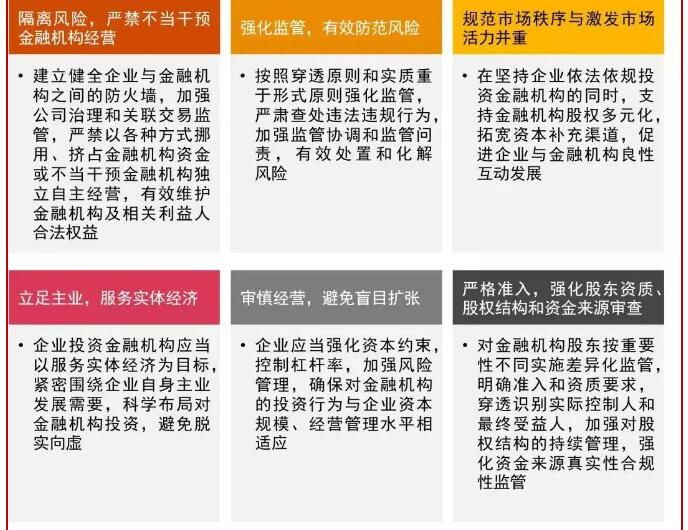 中國人民銀行、銀保監(jiān)會、證監(jiān)會在2018年下發(fā)的《關(guān)于加強非金融企業(yè)投資金融機構(gòu)監(jiān)管的指導(dǎo)意見》中指出,非金融企業(yè)應(yīng)按照六大基本原則,強化股東資質(zhì)、股權(quán)結(jié)構(gòu)、投資資金、公司治理和關(guān)聯(lián)交易,加強實業(yè)與金融業(yè)的風(fēng)險隔離,防范風(fēng)險跨機構(gòu)跨業(yè)態(tài)傳遞。