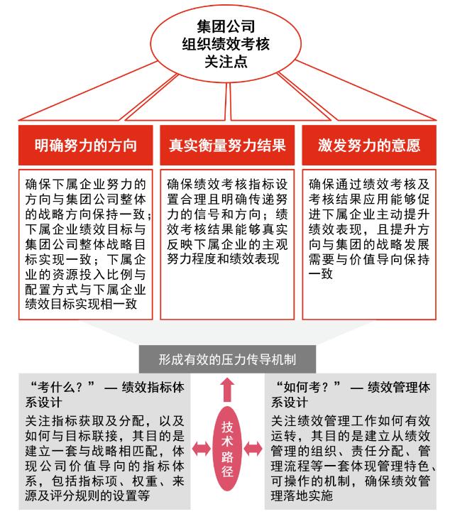 績(jī)效管理是集團(tuán)業(yè)績(jī)管理的職能支撐,沒有戰(zhàn)略的績(jī)效管理最終會(huì)流于形式。無論是地方國(guó)有投資集團(tuán)考核主體轉(zhuǎn)變,還是集團(tuán)發(fā)生戰(zhàn)略轉(zhuǎn)型,勢(shì)必要對(duì)下屬企業(yè)的績(jī)效管理體系進(jìn)行系統(tǒng)化的改革。具體而言,對(duì)下屬企業(yè)的考核管理可從明確努力方向、真實(shí)衡量努力結(jié)果、激發(fā)努力意愿三個(gè)方面入手,通過職能部門的配合協(xié)作,進(jìn)行指標(biāo)體系重塑及考核體系優(yōu)化,最終形成有效的壓力傳導(dǎo)。