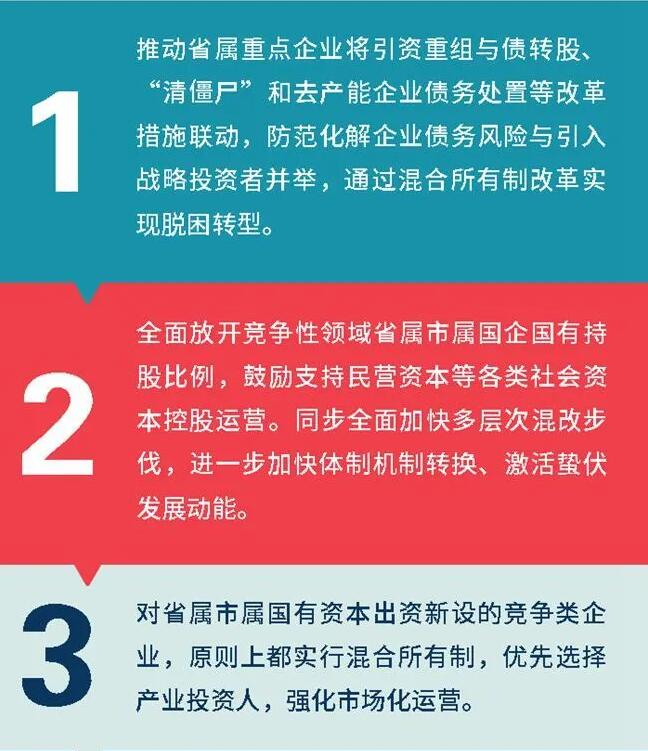 《混改實(shí)施方案》提出,計(jì)劃利用3年左右時(shí)間,推動(dòng)省屬國(guó)有企業(yè)混改比例達(dá)到全國(guó)第一梯隊(duì)水平,市屬國(guó)有企業(yè)混改比例不低于全國(guó)中游水平。從2020年2月—2022年8月分四個(gè)階段實(shí)施。重點(diǎn)通過(guò)加強(qiáng)與央企、民企等域外企業(yè)合資合作,爭(zhēng)取落實(shí)政策措施支持,強(qiáng)化工作措施保障等推動(dòng)國(guó)有企業(yè)混合所有制改革。