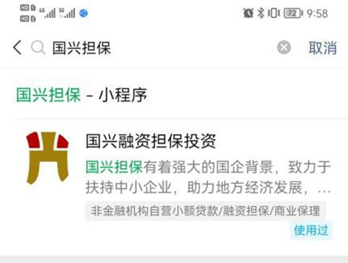 1.微信主界面下拉至微信小程序界面,在【搜索欄】輸入【國興擔(dān)!窟M(jìn)行搜索,在搜索結(jié)果找到【國興融資擔(dān)保投資】。