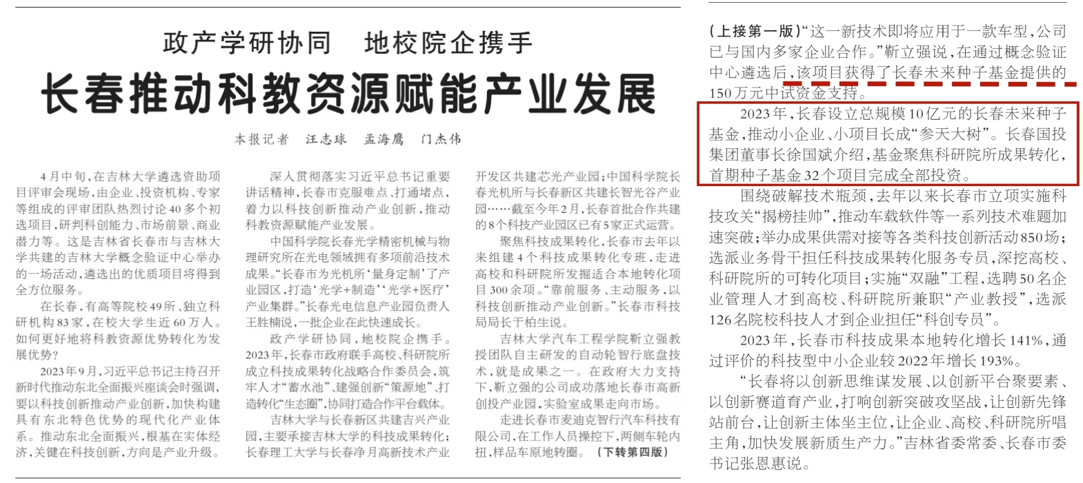 2023年,長(zhǎng)春設(shè)立總規(guī)模10億元的長(zhǎng)春未來種子基金,推動(dòng)小企業(yè)、小項(xiàng)目長(zhǎng)成“參天大樹”。長(zhǎng)春國(guó)投集團(tuán)董事長(zhǎng)徐國(guó)斌介紹,基金聚焦科研院所成果轉(zhuǎn)化,首期種子基金32個(gè)項(xiàng)目完成全部投資。