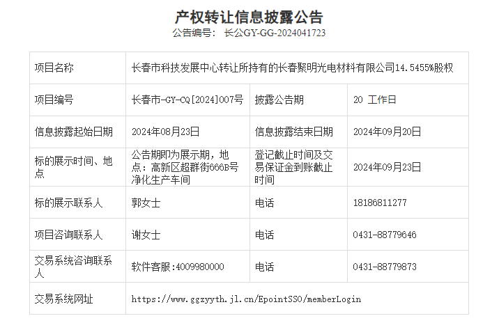 長(zhǎng)春市科技發(fā)展中心轉(zhuǎn)讓所持有的長(zhǎng)春聚明光電材料有限公司14.5%股權(quán)項(xiàng)目信息披露