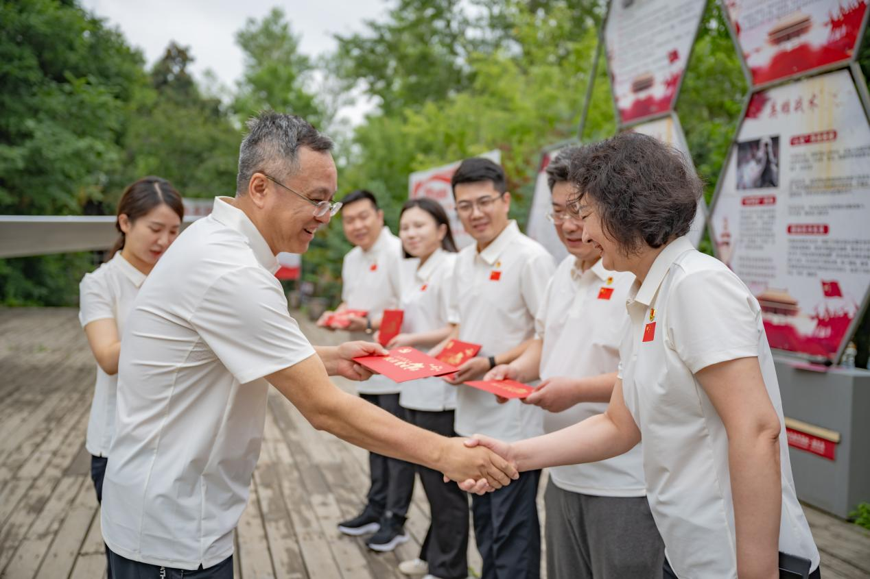 蓮花島紅色教育基地,黨旗鮮紅,誓言鏗鏘!拔抑驹讣尤胫袊伯a(chǎn)黨……隨時準備為黨和人民犧牲一切,永不叛黨!贝┰綍r空的誓言,在現(xiàn)場久久回響,讓長春資本集團機關(guān)支部的每一位黨員都感受到入黨之初的澎湃激情與使命初心;顒蝇F(xiàn)場,集團黨委書記、董事長徐國斌為過“政治生日”的黨員逐個送上“政治生日賀卡”。喜慶的賀卡上不僅印有入黨誓詞和生日寄語,更承載著黨組織的深切關(guān)懷和殷切期望,提醒大家時刻不忘黨員身份,永葆先進本色。